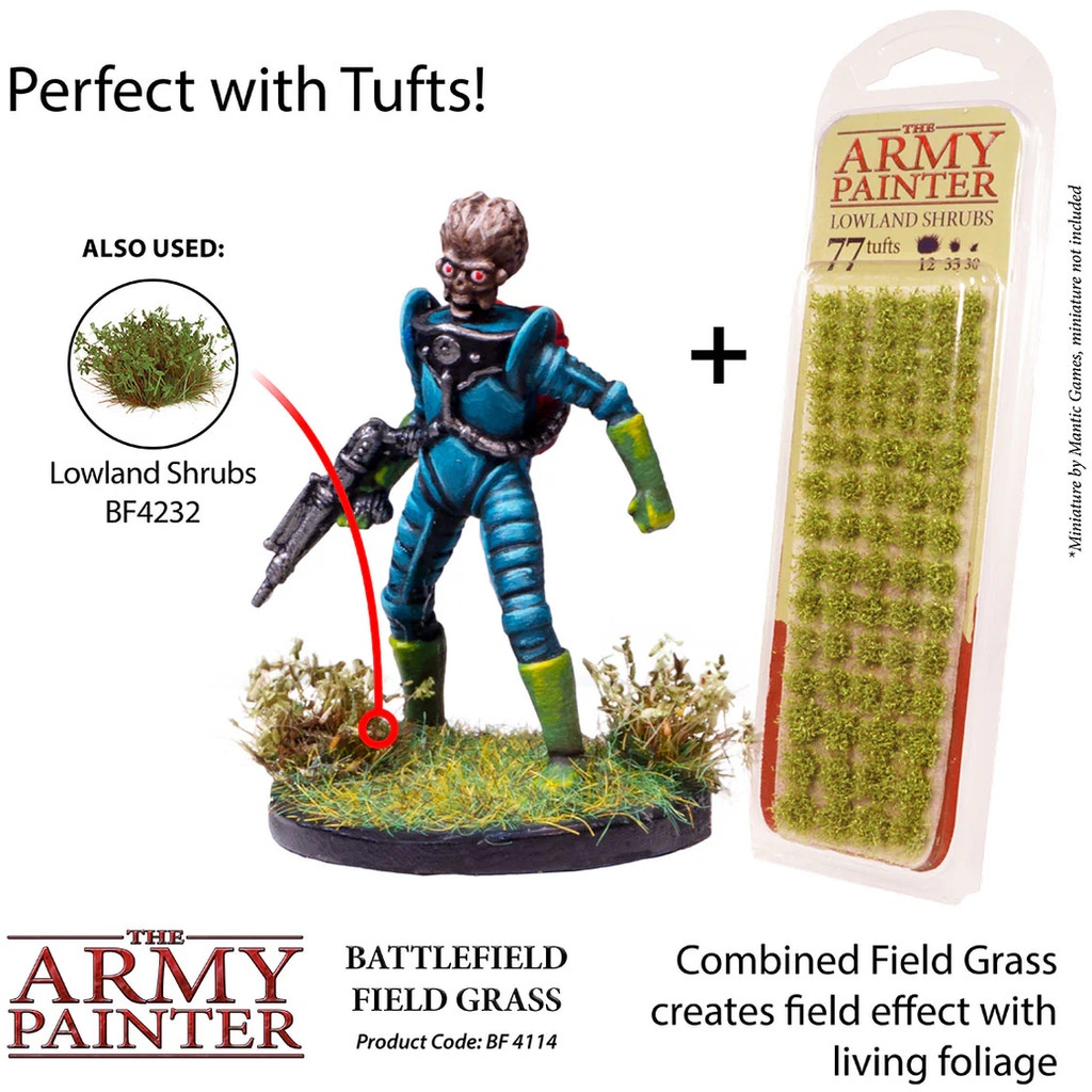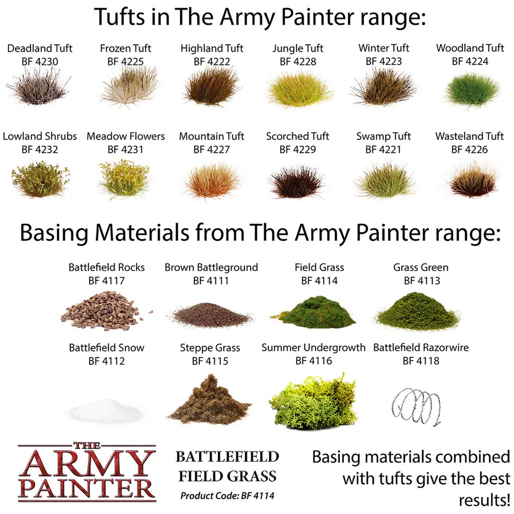 Transform your dioramas into living landscapes with the Battlefield Basing: Field Grass from The Army Painter. Whether you want to create lush meadows, overgrown gardens or dense forests - the Field Grass adapts to any scenario. Combine it with other materials such as trees, rocks or buildings to create even more detailed dioramas.