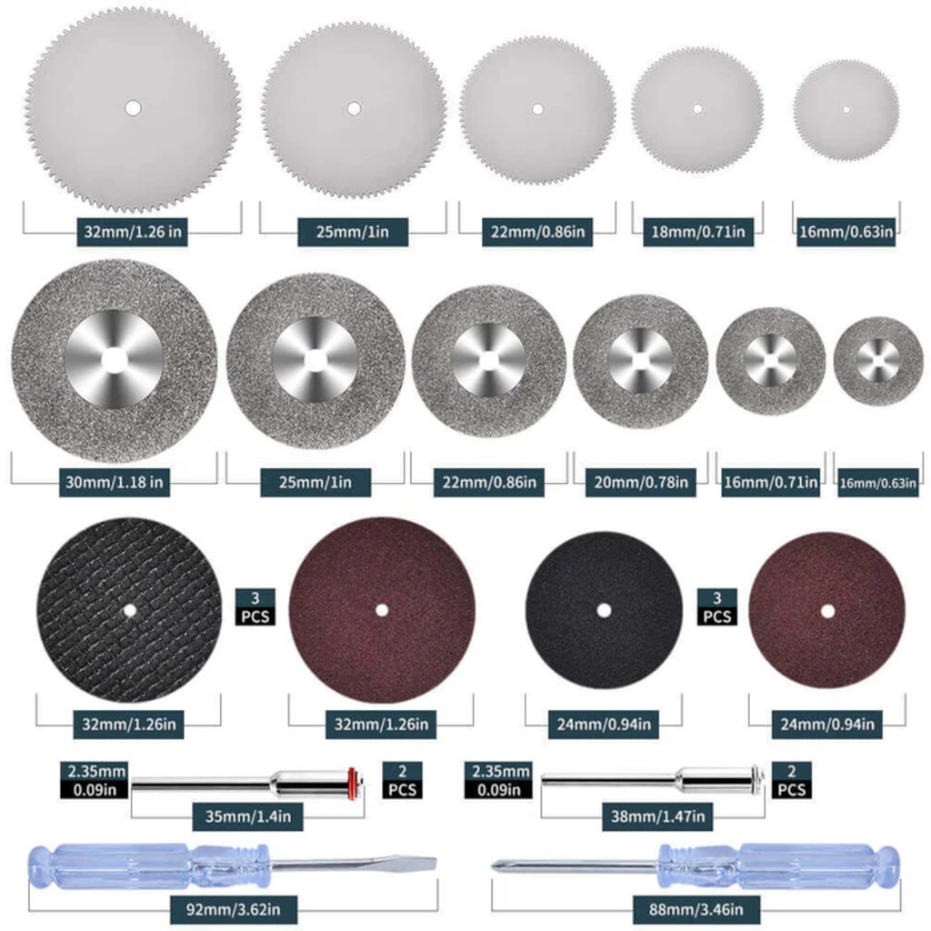The Hanboost Cutting Disc Set is the perfect add-on for your rotary tool, offering a comprehensive selection of high-quality cutting discs for precise and versatile work. It includes HSS circular saw blades, diamond-coated cutting discs, resin cutting wheels, and mini screwdrivers ¨C everything you need for detailed cutting across a wide range of materials!