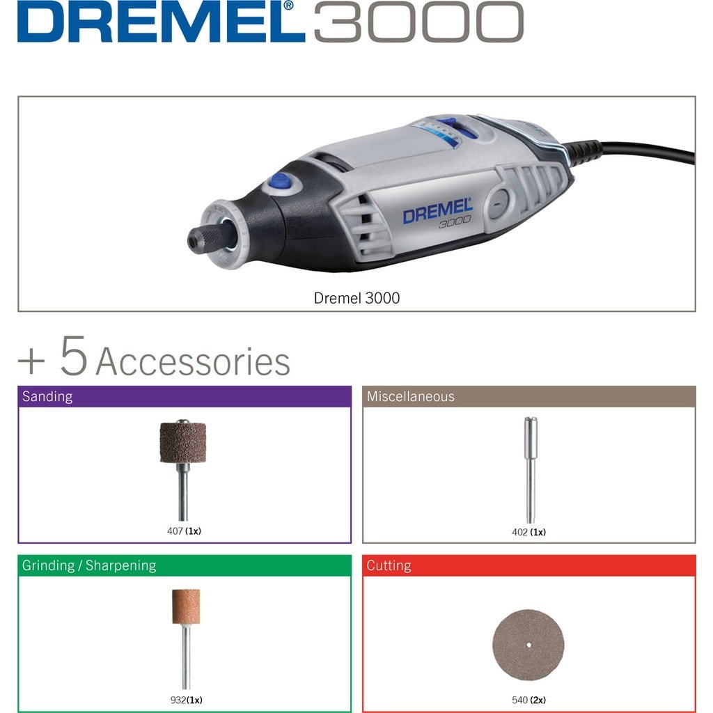 The Dremel 3000-5 is the perfect companion for all DIY enthusiasts, hobbyists, artists and many more! The versatile multi-function tool comes with a wide range of accessories and can be used for carving, engraving, milling, cutting/separating, sanding, grinding, sharpening, polishing and cleaning.