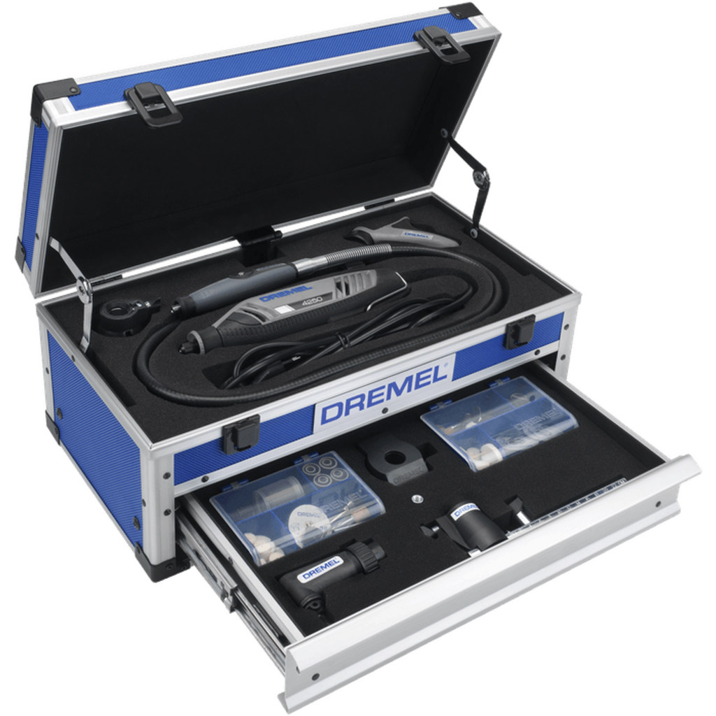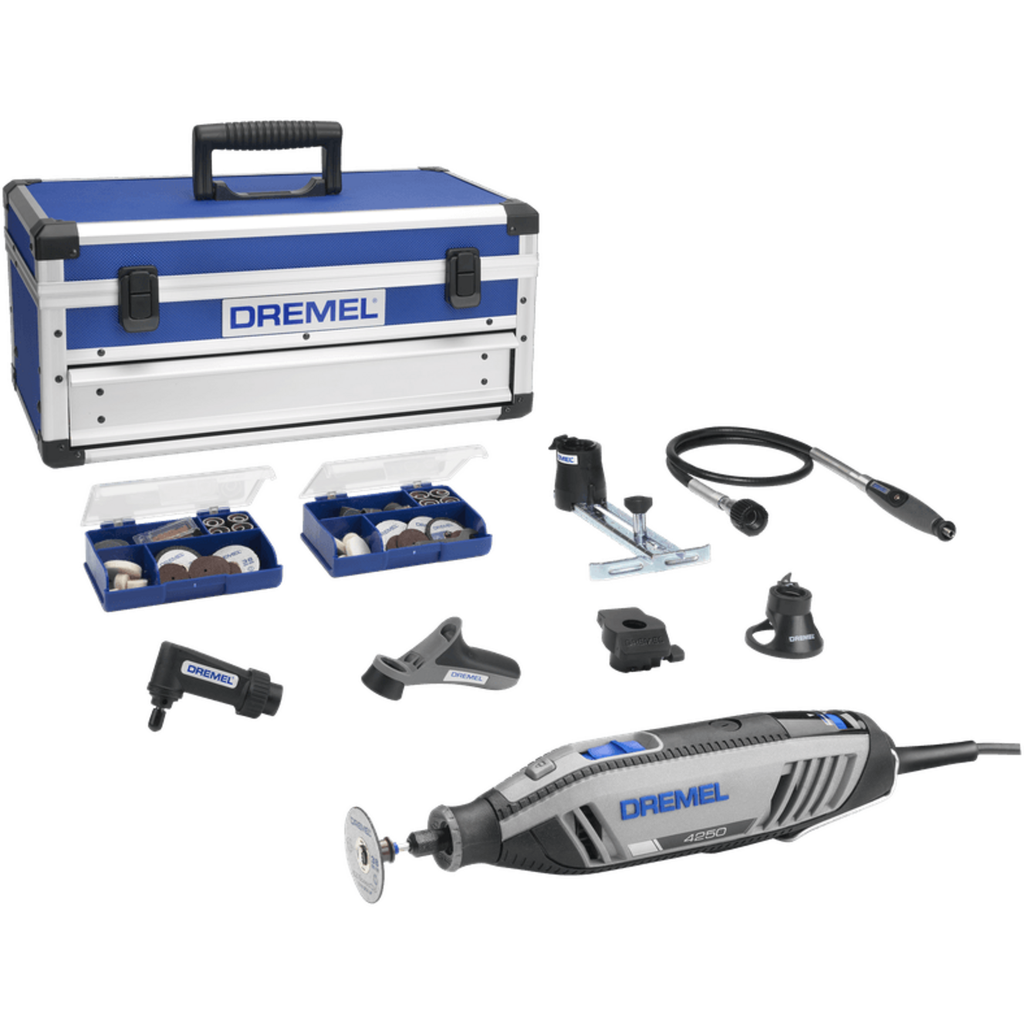 The Dremel 4250-6/128 is a true all-rounder when it comes to cutting, drilling, grinding, sanding, polishing and engraving! The corded multi-function tool works with a powerful 175 watt motor and offers incredible precision and maximum performance even in the most demanding applications and hardest materials.