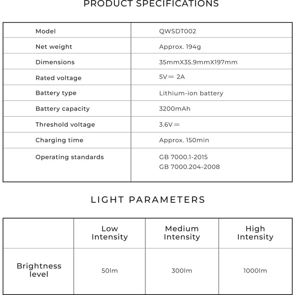 The 3200 mAh lithium battery lasts up to 65 hours, so you don't have to worry about running out of batteries. The torch is charged very quickly and easily via USB-C - for maximum flexibility on the go!