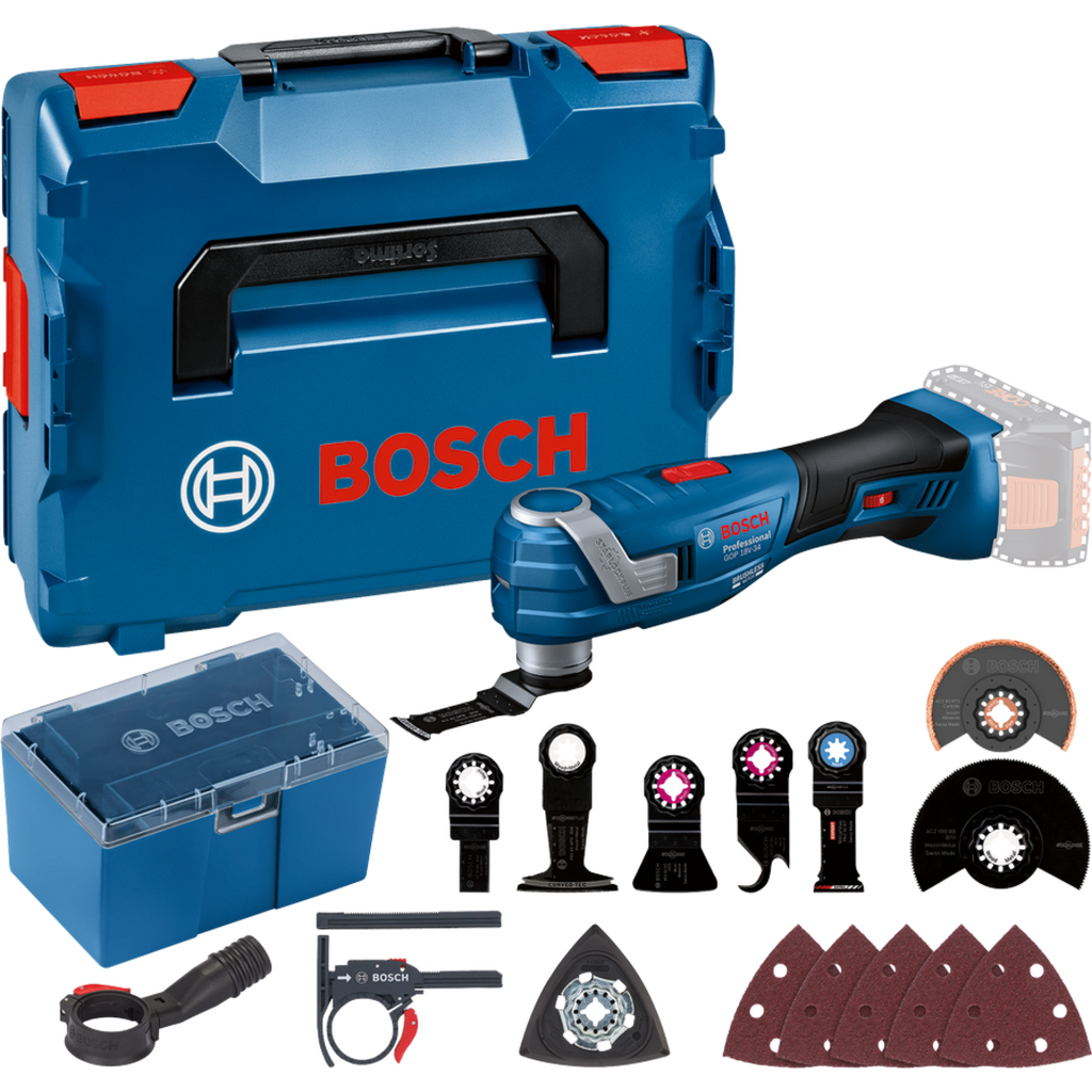 | 1 x GOP 18V-34 cordless multi-cutter 1 x StarlockPlus BIM plunge saw blade PAIZ 32 APB, Curved-Tec, Wood + Metal 1 x L-BOXX | 1 x GOP 18V-34 cordless multi-cutter 1 x Starlock ASZ 32 SC HCS multi-blade, multi-material 1 x Starlock extraction adapter with clamping neck 1 x Starlock BIM segment saw blade ACZ 100 BB, Wood + Metal 1 x Starlock BIM plunge saw blade AIZ 20 AB, Wood + Metal 1 x Starlock Carbide-RIFF segment saw blade ACZ 85 RT3, Grout + Abrasive 1 x Starlock delta sanding plate AVZ 93 G 1 x Starlock HCS scraper ATZ 52 SC, rigid, multi-material 1 x Starlock Plus Metal Max plunge saw blade PAIZ 32 AIT, Metal 1 x Starlock depth gauge Expert 1 x StarlockPlus BIM plunge saw blade PAII 65 APB, Curved-Tec, Wood + Metal 1 x StarlockPlus BIM plunge saw blade PAIZ 32 APB, Curved-Tec, Wood + Metal 1 x small blue box for Starlock accessories 5 x sanding sheets, K 2x80, 2x120, 1x240 1 x L-BOXX |