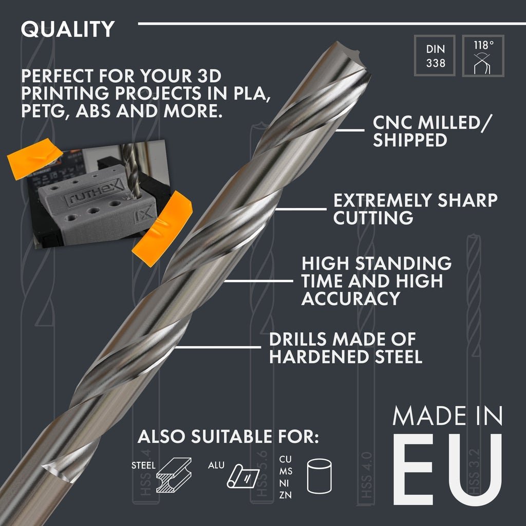 This HSS drill set is specifically designed for threaded inserts and is perfect for use with a wide range of materials including plastic, PLA, PETG, ABS, steel, aluminium, copper, brass, nickel and zinc.