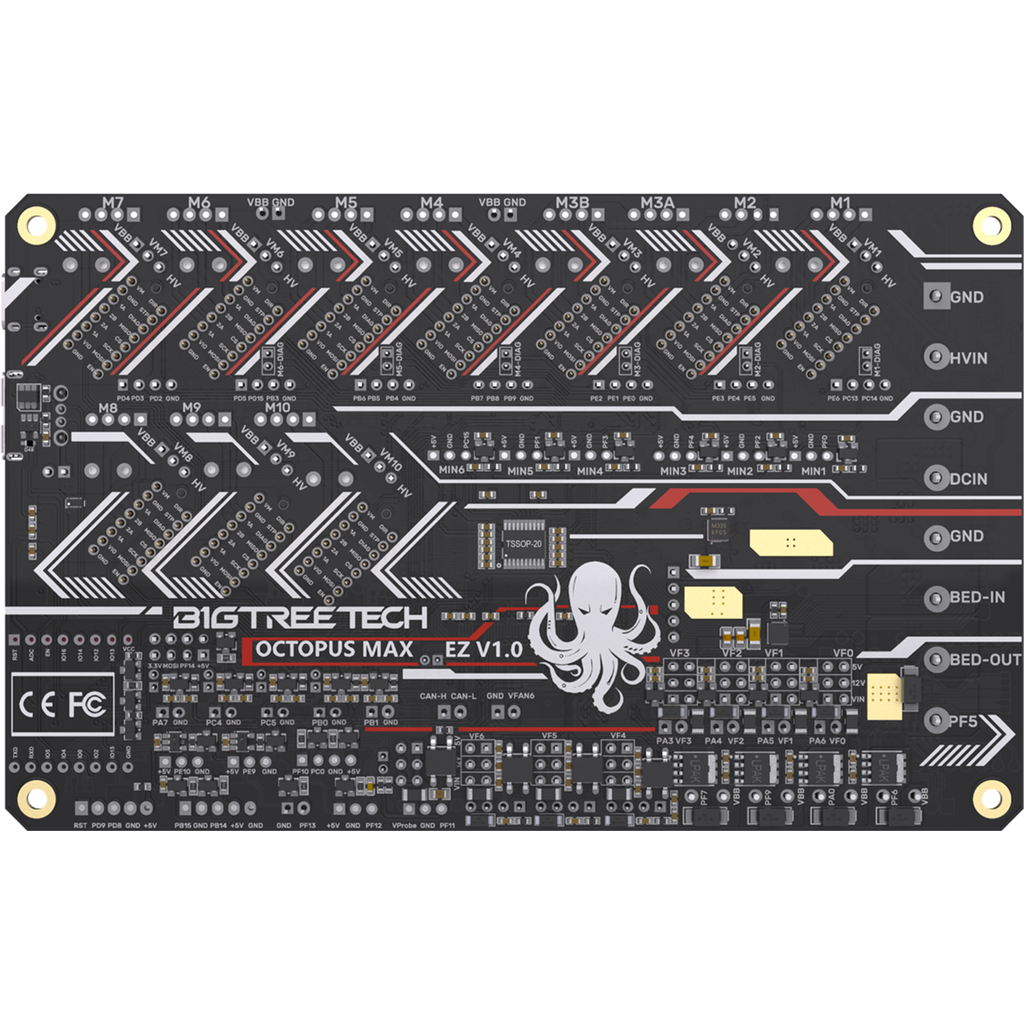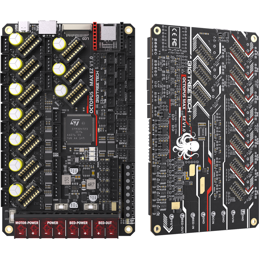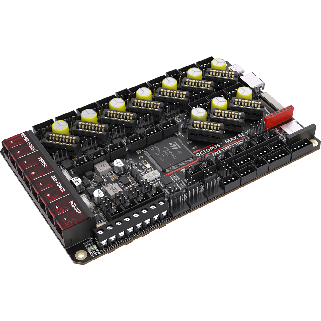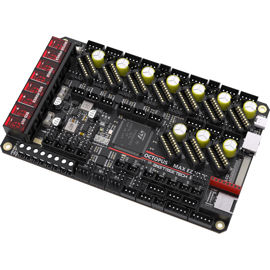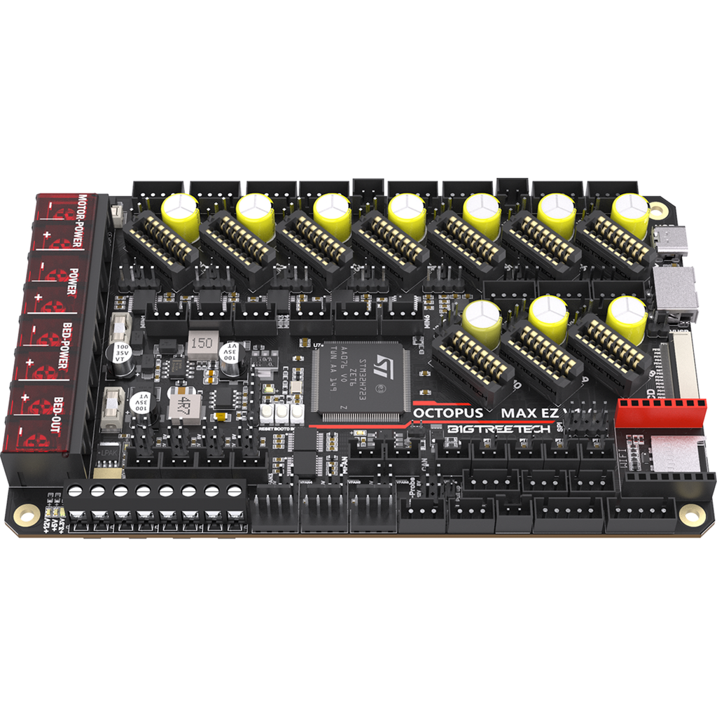BIGTREETECH's Octopus Max EZ is a 32-bit motherboard with many interfaces for versatile upgrade possibilities. The main board is compatible with Klipper and Marlin as well as with a Raspberry Pi.