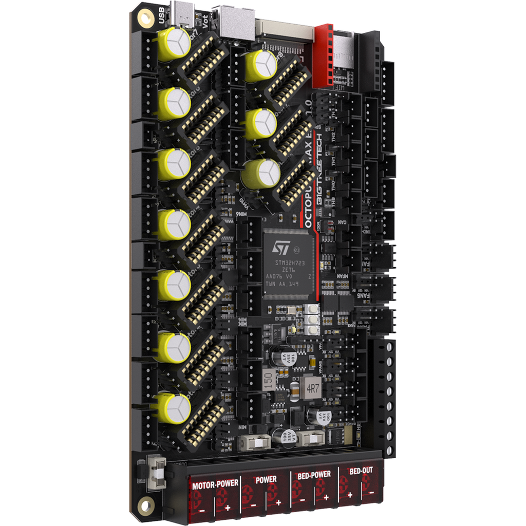 The 32-bit 550MHz ARM Cortex-M7 STM32H723ZET6 microcontroller is compatible with both Marlin and Klipper.