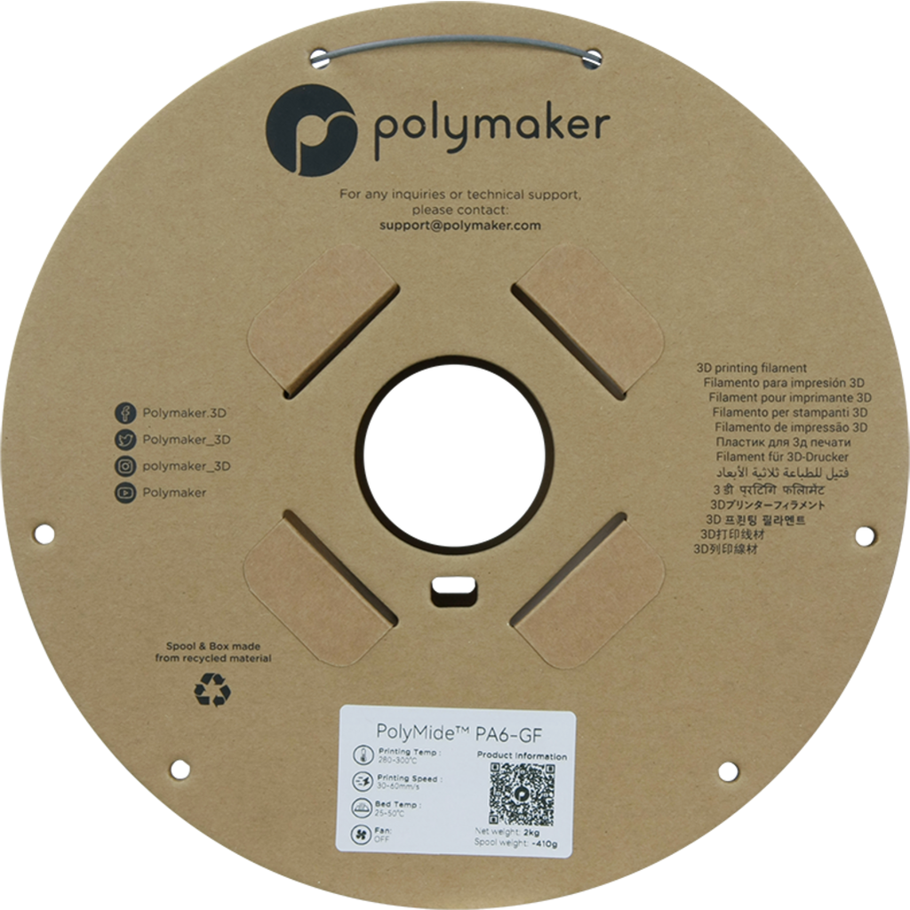 PolyMide ? PA6-GF is a glass fibre reinforced PA6 filament (nylon 6). The material has excellent thermal and mechanical properties without affecting the layer adhesion.