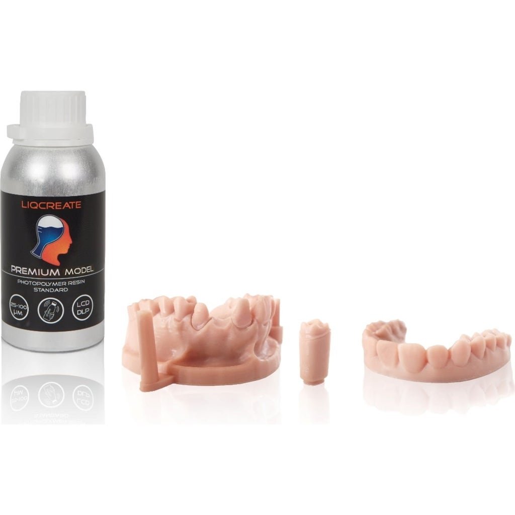 Liqcreate Premium Model is perfect for making precision dental models. This photopolymer is a matt, opaque, skin/peach coloured resin. The matt colour highlights the depth and detail of your dental models and provides a perfect view of undercuts in 3D printed models.