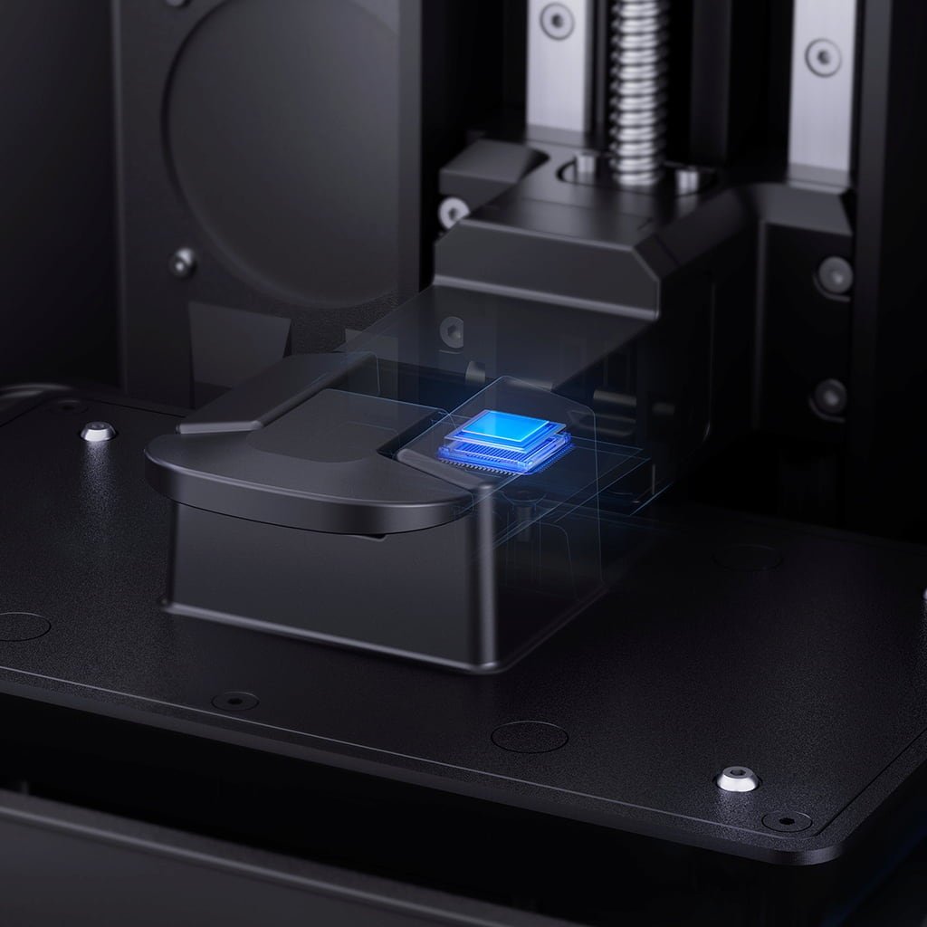 Intelligent mechanical sensor: To prevent possible damage to the LCD screen (e.g. caused by foreign objects) and to detect resin defects and levelling errors, the printer is equipped with a special mechanical sensor that supports the residue detection function. The reliable detection system ensures greater safety and better printing results.