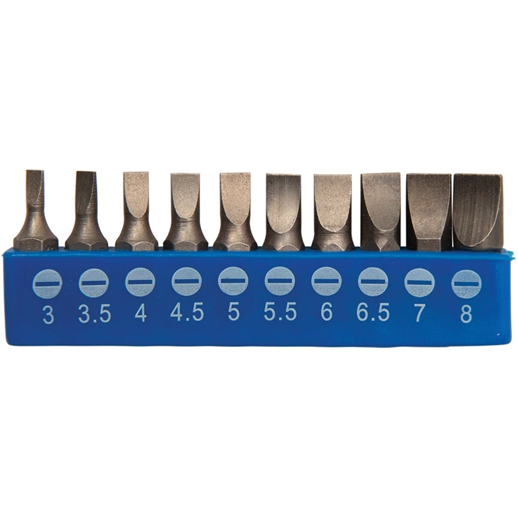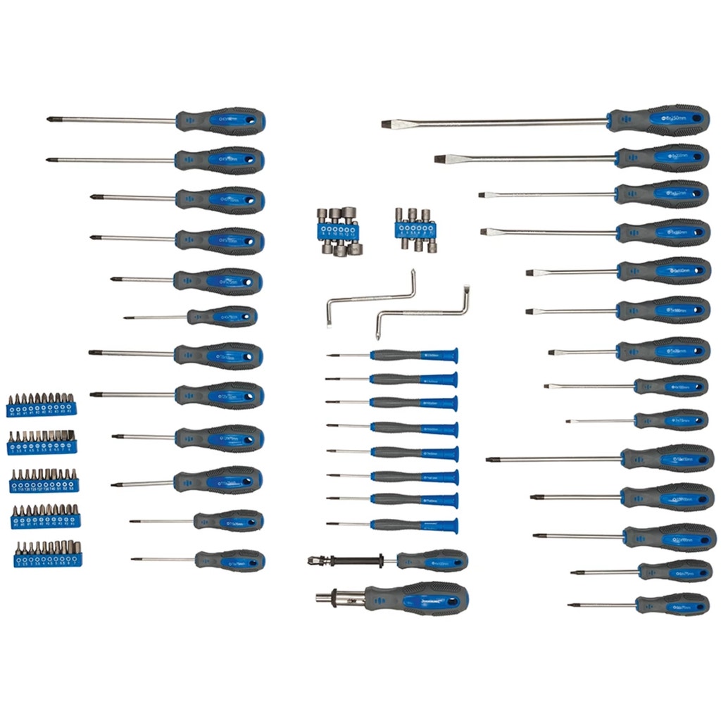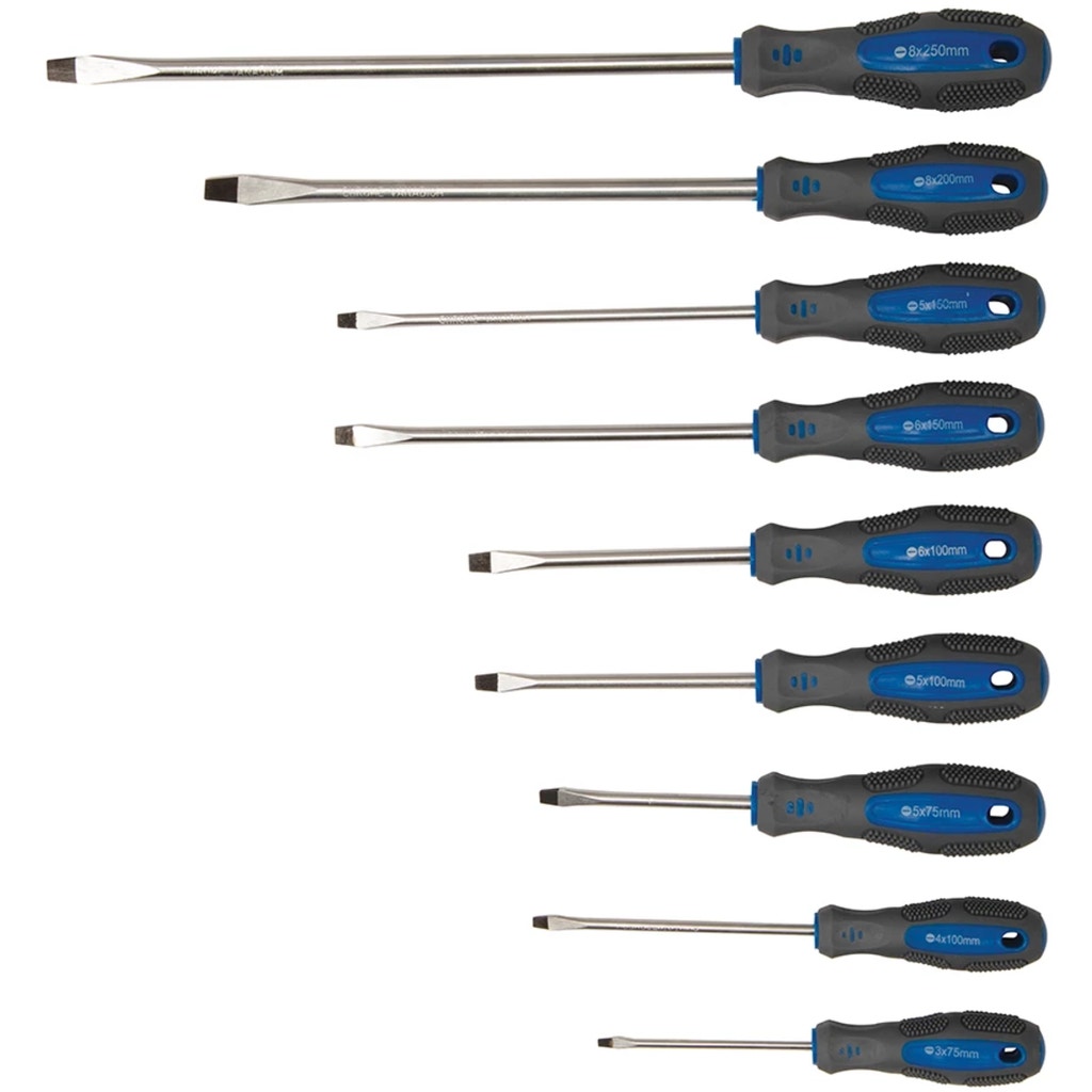 - 9 x slotted screwdrivers (3x75, 4x100, 5x75, 5x100, 6x100, 5x150, 6x150, 8x200, 8x250 mm)
