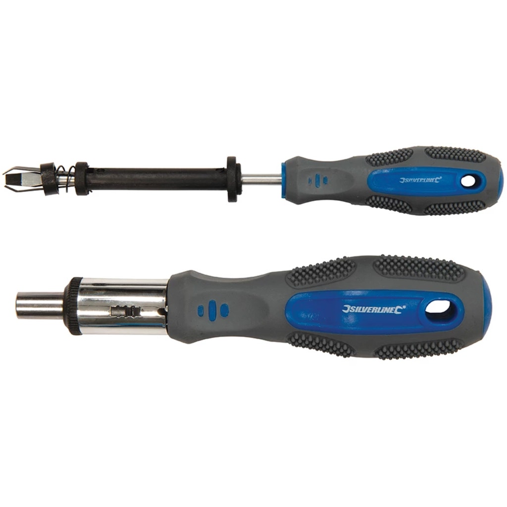 This screwdriver set from Silverline contains high-quality hand tools with ergonomically shaped soft handles that ensure effortless work. While the robust blades are made of chrome vanadium, the screwdriver tips are made of sturdy CV steel. In addition to standard, precision and ratchet screwdrivers, the set also includes a wide range of versatile screwdriver bits.
