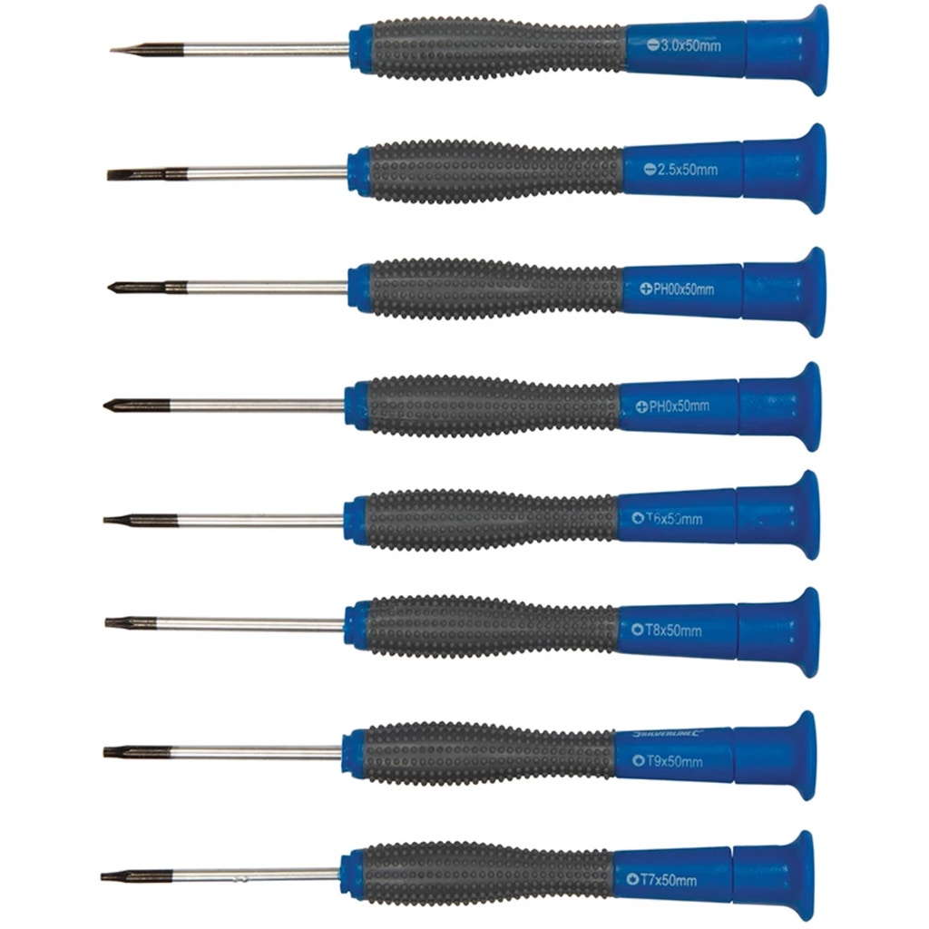 - 8 x precision screwdrivers (SL 2.5x50, SL 3.0x50, PH00x50, PH0x50, T6x50mm, T7x50, T8x50, T9x50 mm)