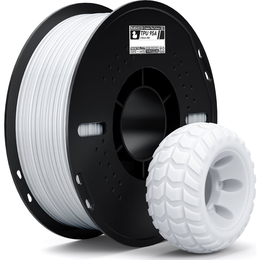 Elegoo TPU is an elastic filament with 95A Shore hardness that can be stretched to 5 times its original length without breaking. The material is extremely resistant to abrasion, chemicals, UV radiation and oils, making it ideal for the production of functional parts and prototypes.