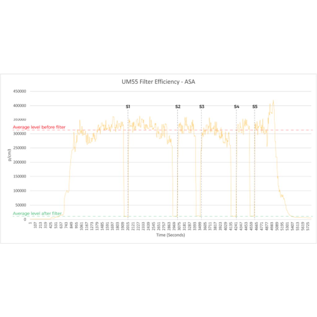 Tip: The UM55 Filter Efficiency Test (see photo) shows how the filter performs under real conditions when used with ASA filaments. The UM55 filter impresses with an average filter efficiency of 96.36 % - even with ultra-fine particles between 10 and 200 nm.