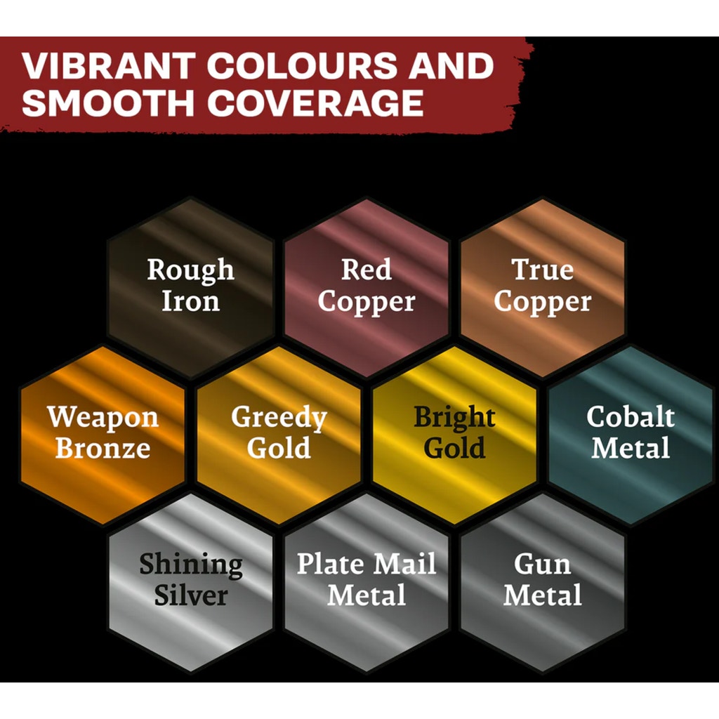 The Metallics set contains a large selection of high-quality, water-based paints that are perfect for armour, weapons and machines. The colours are easy to mix and dry quickly so that you can continue working without long waiting times. With their high pigment density, they provide excellent coverage and create a flawless, shimmering finish.